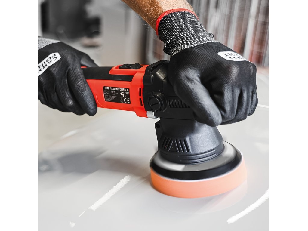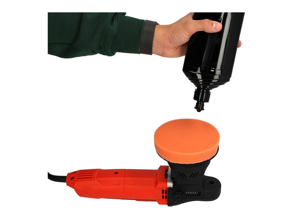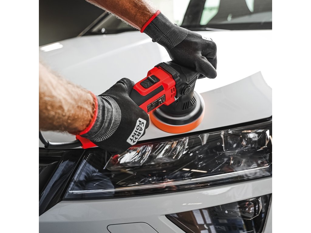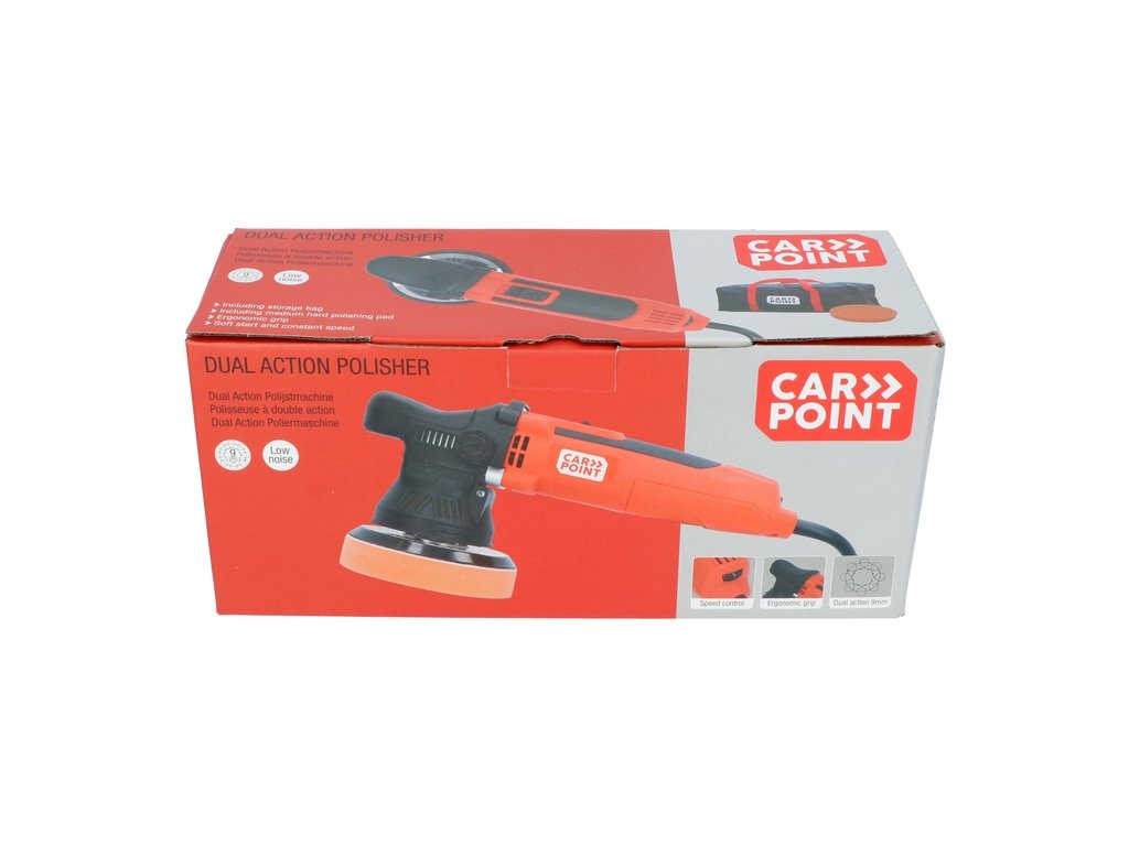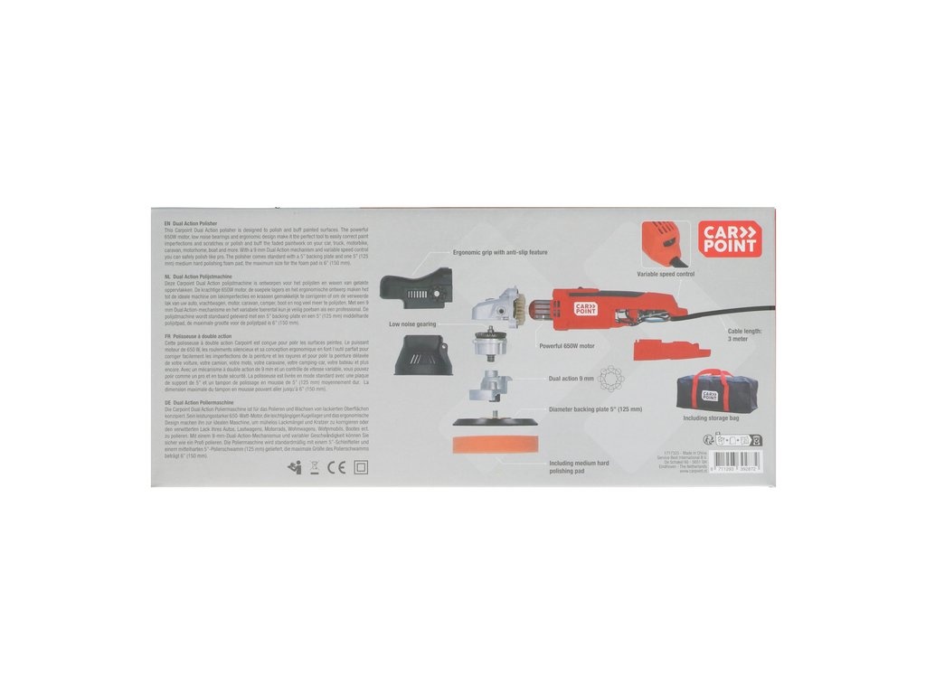 De Carpoint dual action polijstmachine is ontworpen voor het effectief verwijderen van lakdefecten, oxidatie, lichte krasjes en swirls of het aanbrengen van een polish en wax. De pad maakt gelijktijdig een draaiende en oscillerende beweging (Dual Action) en heeft een excentrische uitslag van 9mm waardoor zeer nauwkeurig gewerkt kan worden. De machine heeft 6 verschillende snelheden (polijstbewegingen: 2000-6400/min) die met de draaischakelaar traploos instelbaar zijn aan de achterzijde. De basisplaat heeft een diameter van 125mm, en door het klittenband op de backing plate zijn de pads makkelijk op en van de polijstmachine te halen. Eenvoudig aan- en uitzetten met de schakelaar bovenop de machine.