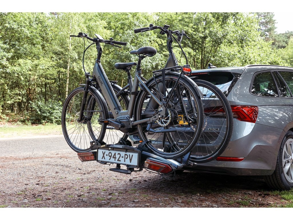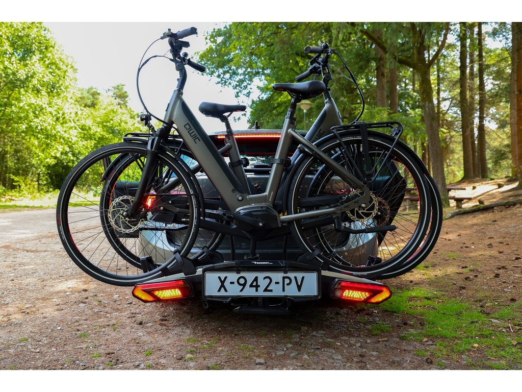 Met deze opvouwbare aluminium fietsdrager E-carrier brengt Twinny Load een fietsendrager waarin kwaliteit, design en functionaliteit samenkomen. Deze fietsdrager is geschikt voor 2 (elektrische) fietsen met een maximaal gewicht van 60kg (max. 2x30kg) en wordt door middel van een afsluitbare snelkoppeling gemonteerd op de trekhaakkogel. Deze fietsdrager beschikt over een voetbediende kantelfunctie, waardoor de kofferbak ten alle tijden bereikbaar blijft, en is voorzien van afsluitbare frameklemmen. Met 13-polige stekker en LED verlichting. Instelbare aluminium wielgoten met snelsluitingen om de wielen vast te zetten. Twinny Load fietsendragers voldoen aan de Europese richtlijnen en zijn gemakkelijk in het gebruik. Met Twinny Load vervoer je jouw fietsen veilig, stabiel en gemakkelijk.